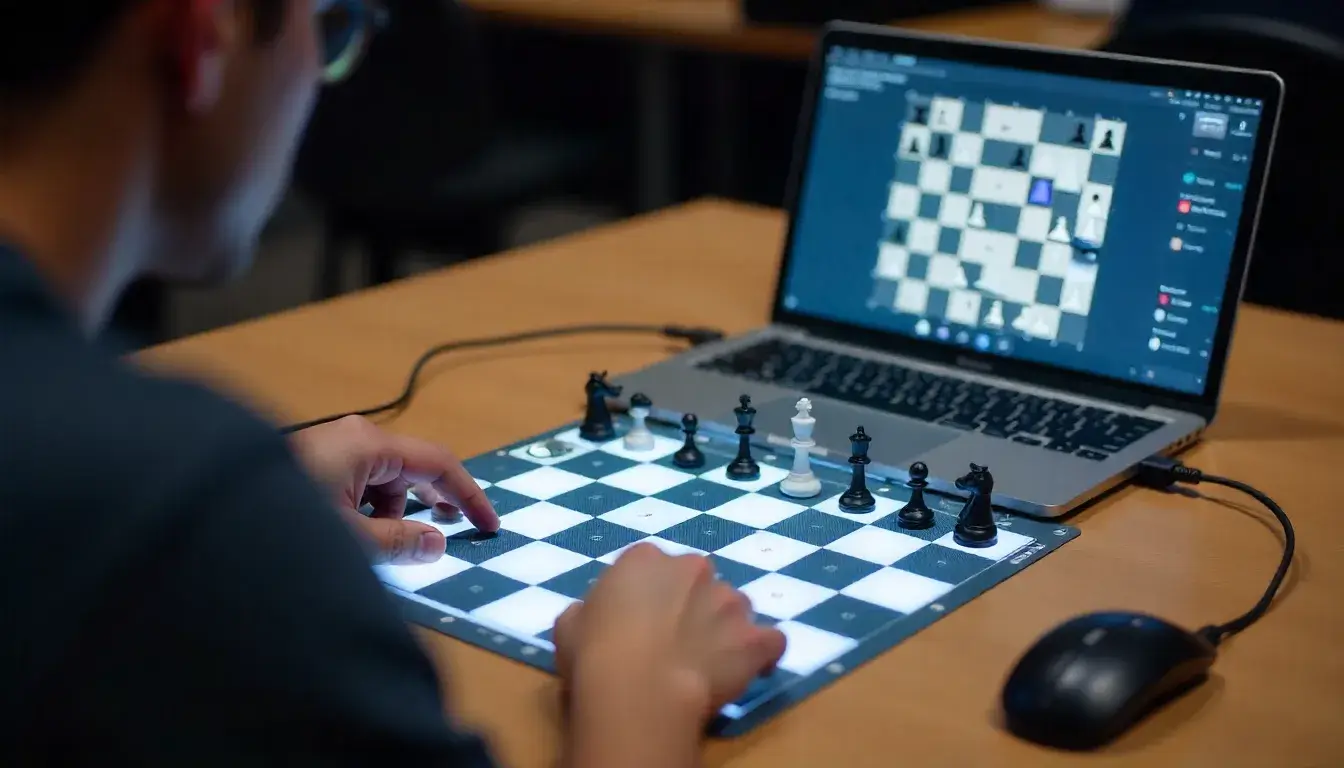 An electronic chess board allows players to move real pieces on a physical board while automatically transmitting those moves online. This innovation blends the human touch of traditional play with the analytical power and connectivity of modern technology.